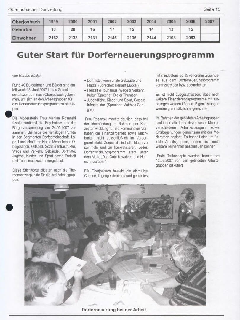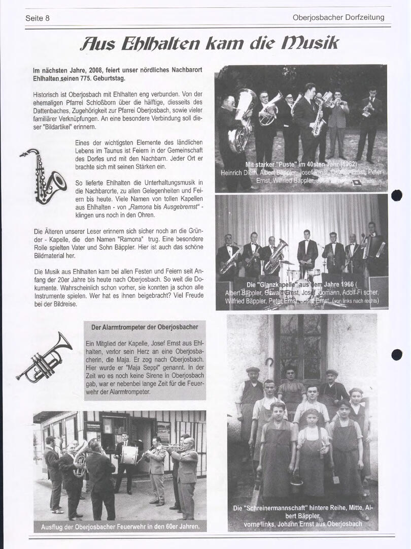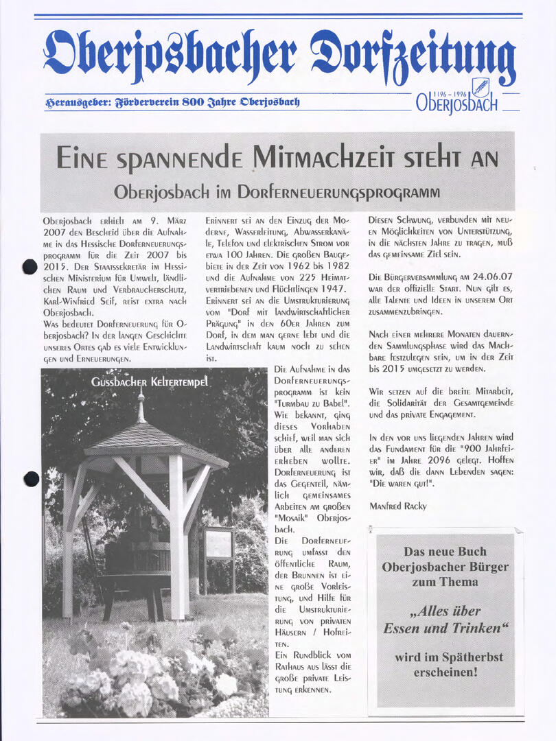 Im November 1994 erschien die erste Ausgabe der Oberjosbacher Dorfzeitung – ursprünglich, um die Oberjosbacher auf das bevorstehende 800-jährige Ortsjubiläum einzustimmen und zu motivieren. Anfangs wurde die Zeitschrift viermal im Jahr veröffentlicht. Doch aufgrund des hohen Arbeitsaufwands und der damals beträchtlichen Druckkosten musste die Erscheinungsfrequenz im Laufe der Jahre reduziert werden – zunächst auf zwei, später auf eine Ausgabe pro Jahr.