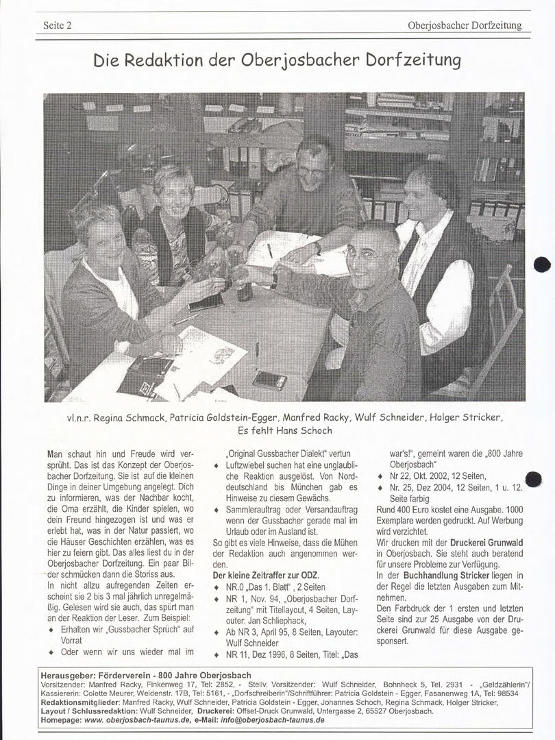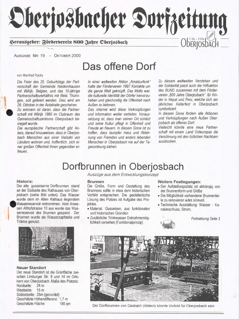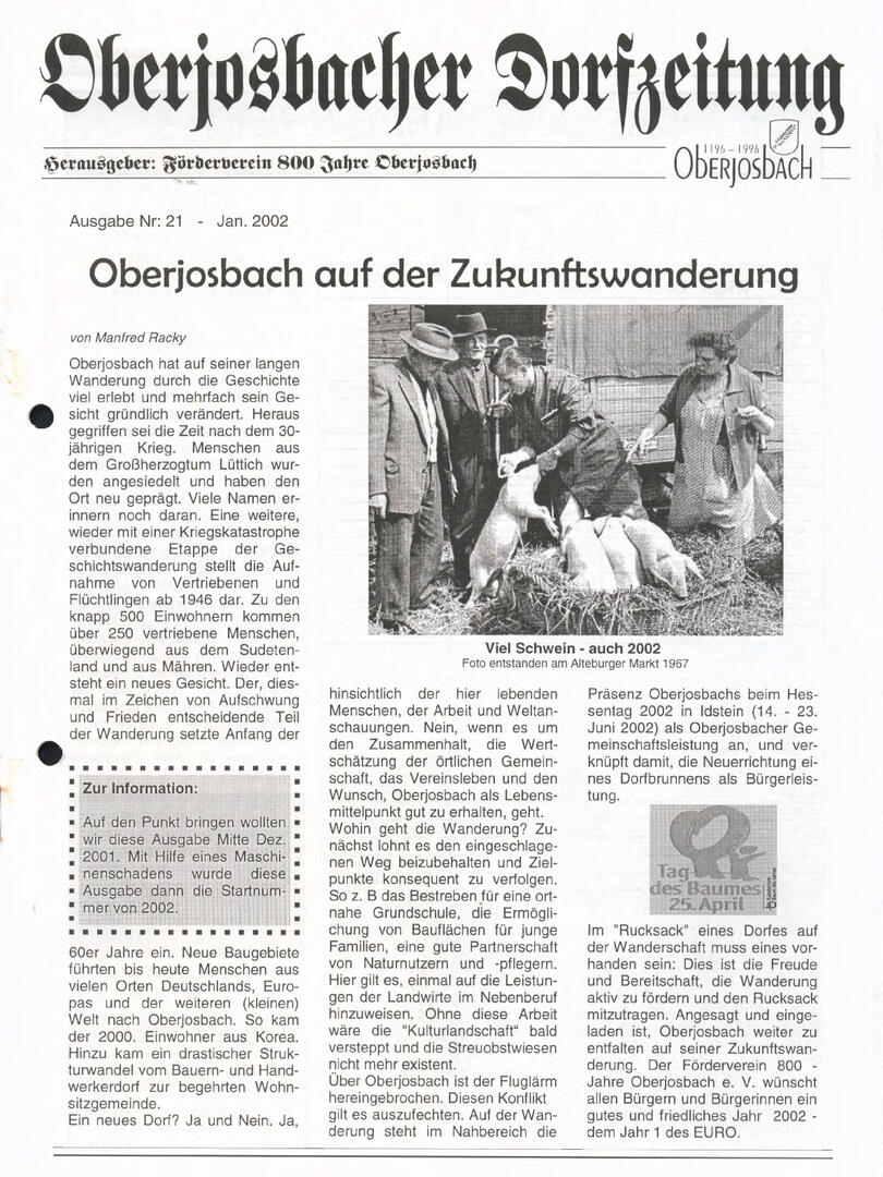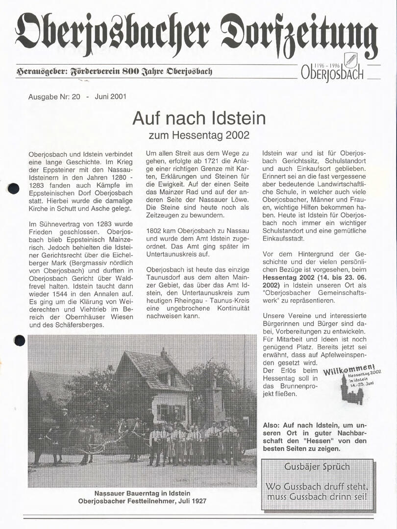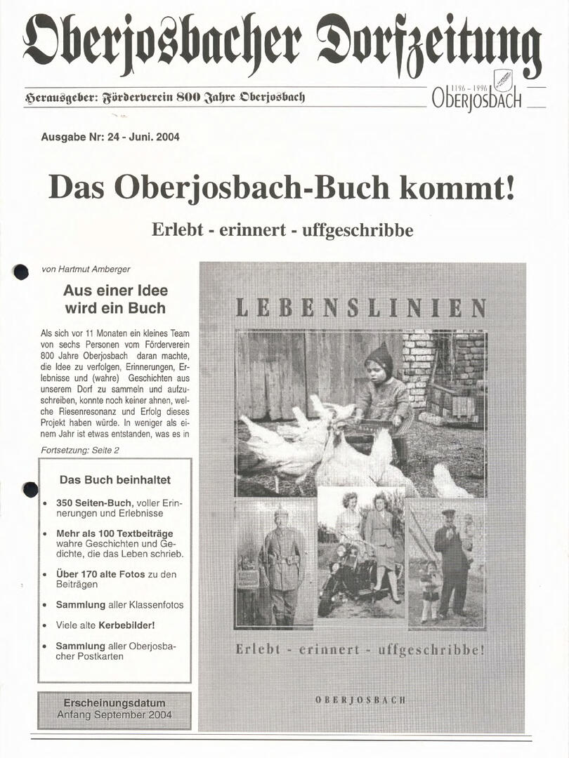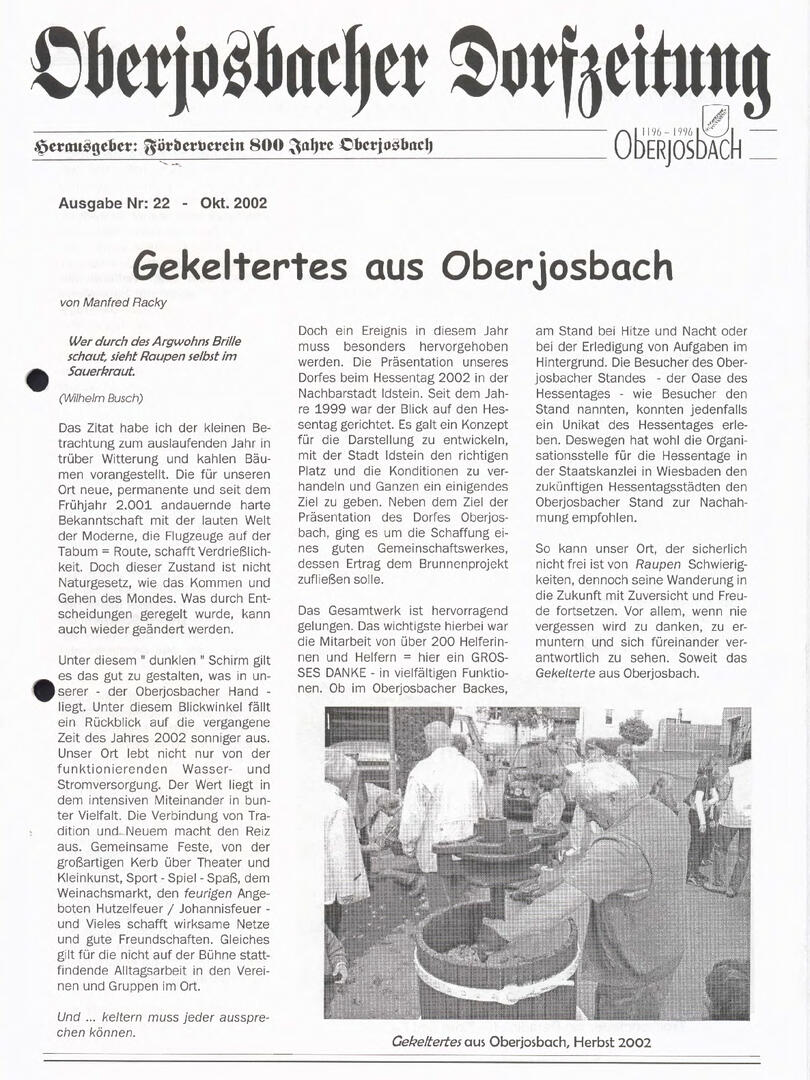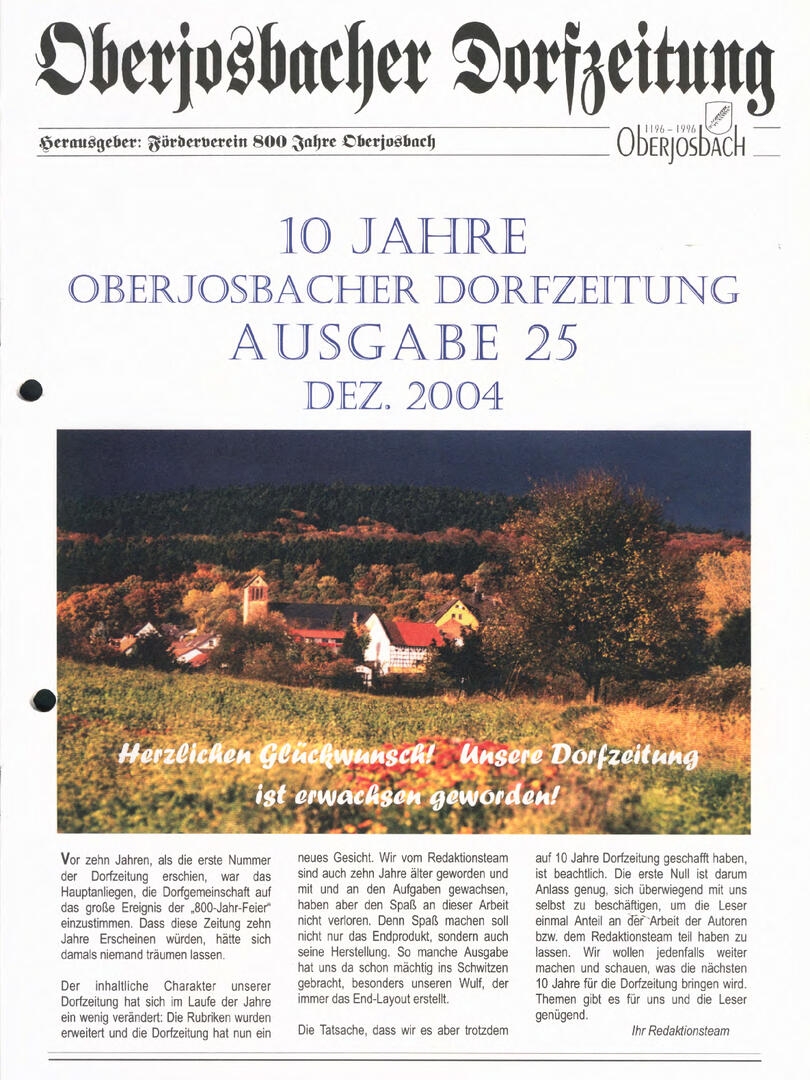 Im November 1994 erschien die erste Ausgabe der Oberjosbacher Dorfzeitung – ursprünglich, um die Oberjosbacher auf das bevorstehende 800-jährige Ortsjubiläum einzustimmen und zu motivieren. Anfangs wurde die Zeitschrift viermal im Jahr veröffentlicht. Doch aufgrund des hohen Arbeitsaufwands und der damals beträchtlichen Druckkosten musste die Erscheinungsfrequenz im Laufe der Jahre reduziert werden – zunächst auf zwei, später auf eine Ausgabe pro Jahr.