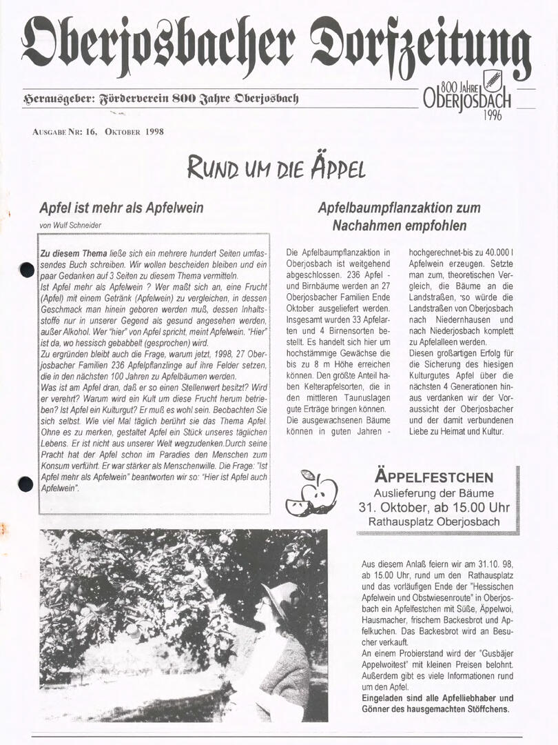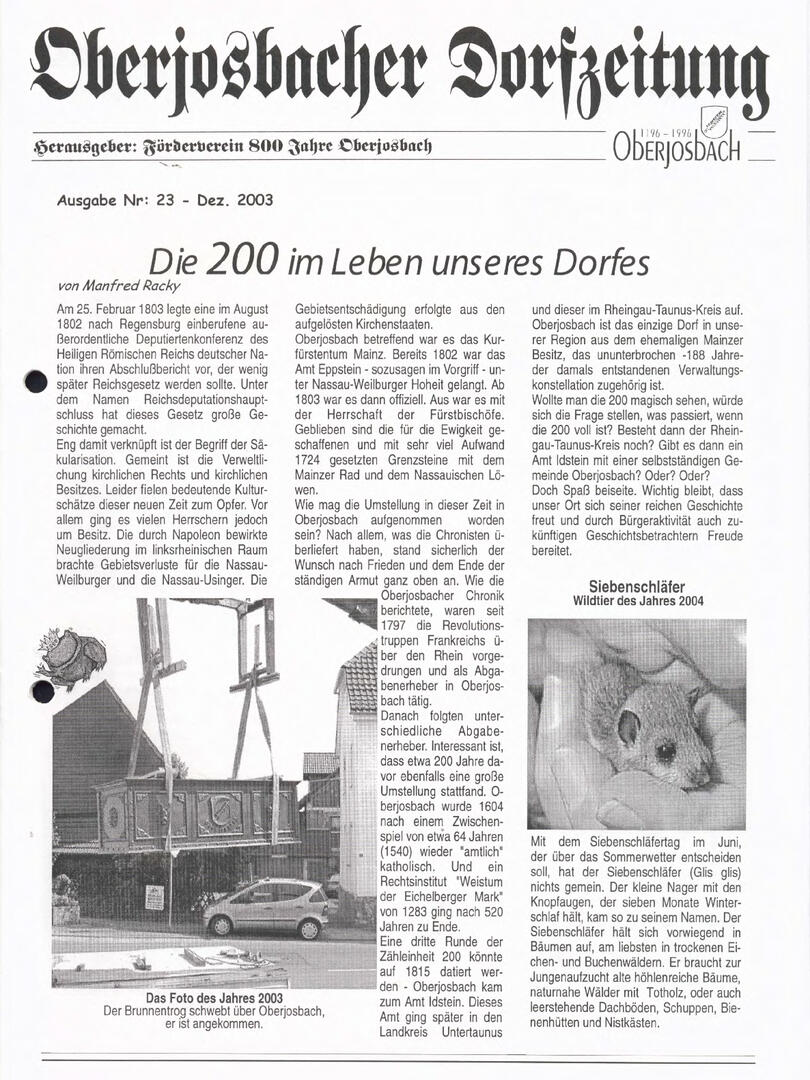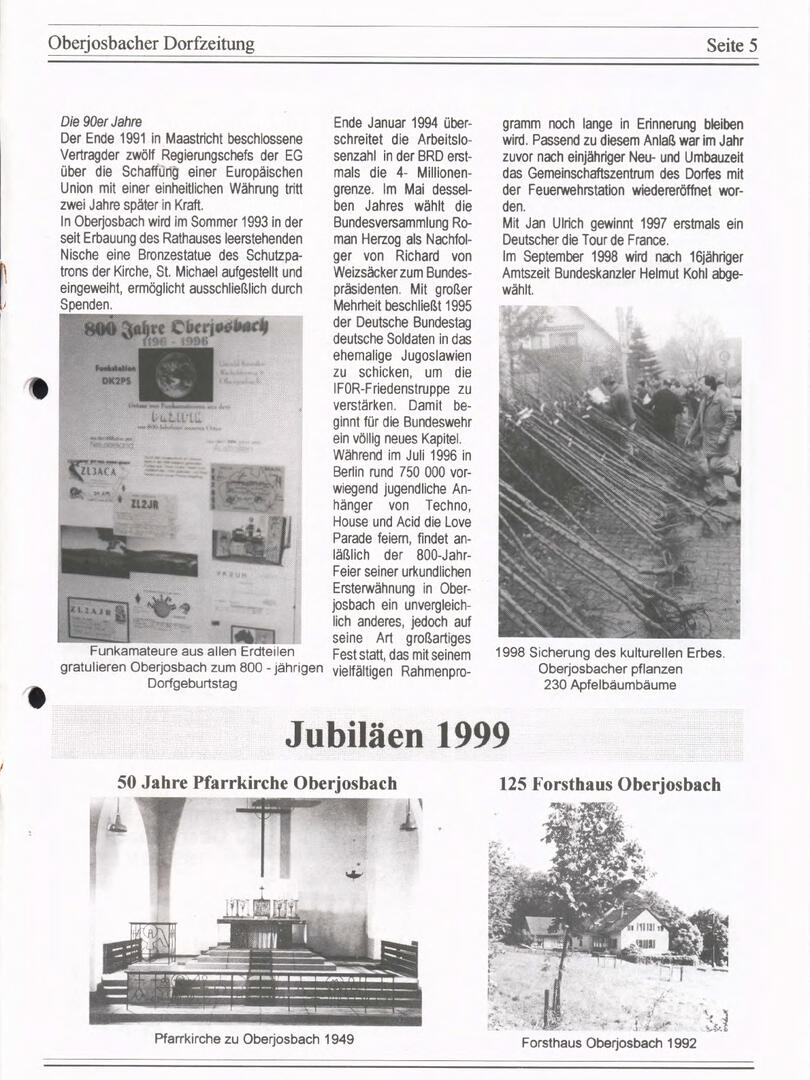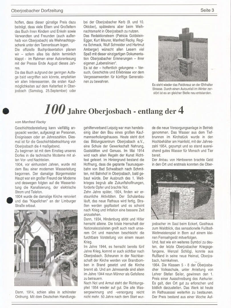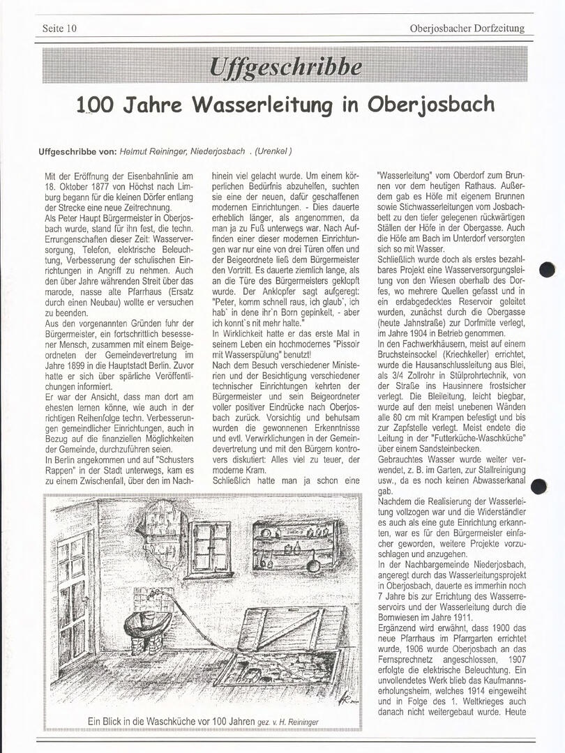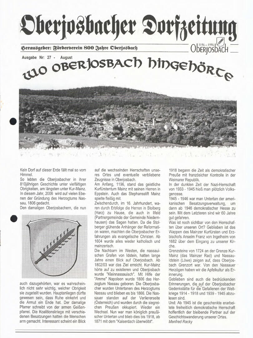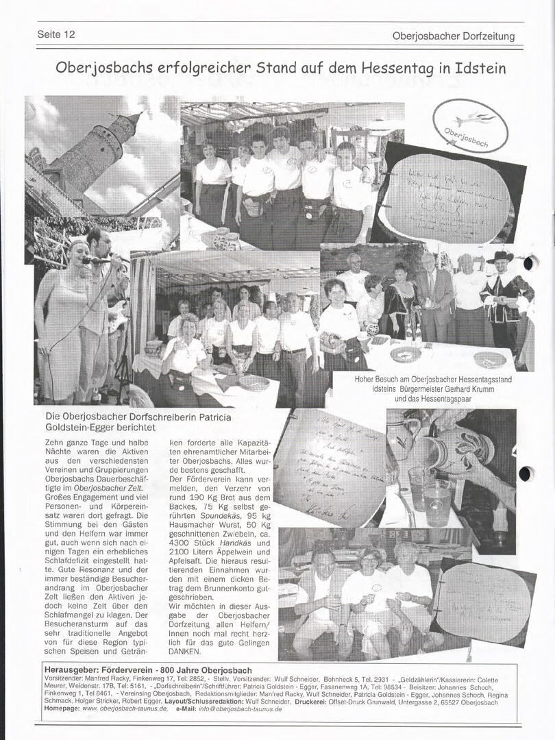 Im November 1994 erschien die erste Ausgabe der Oberjosbacher Dorfzeitung – ursprünglich, um die Oberjosbacher auf das bevorstehende 800-jährige Ortsjubiläum einzustimmen und zu motivieren. Anfangs wurde die Zeitschrift viermal im Jahr veröffentlicht. Doch aufgrund des hohen Arbeitsaufwands und der damals beträchtlichen Druckkosten musste die Erscheinungsfrequenz im Laufe der Jahre reduziert werden – zunächst auf zwei, später auf eine Ausgabe pro Jahr.