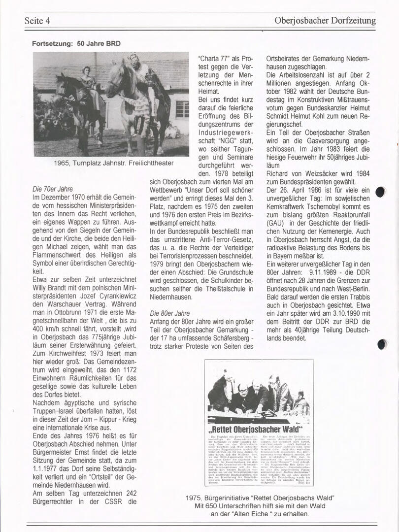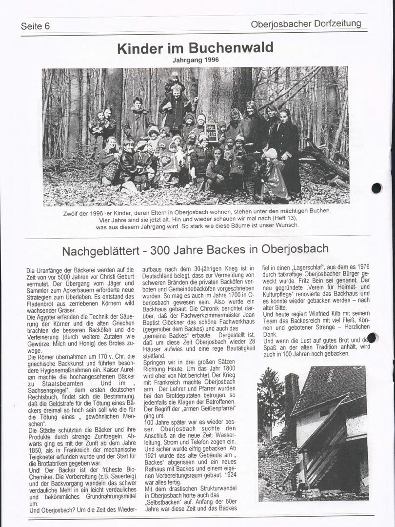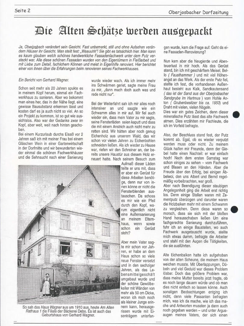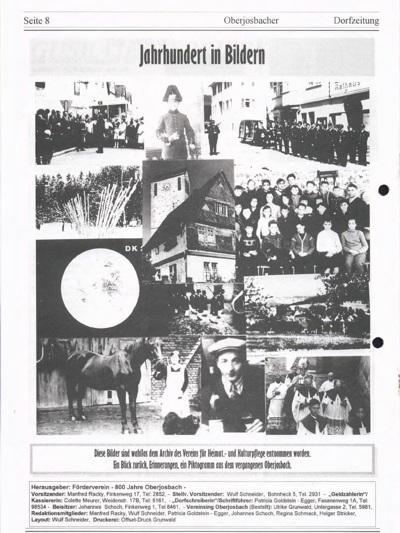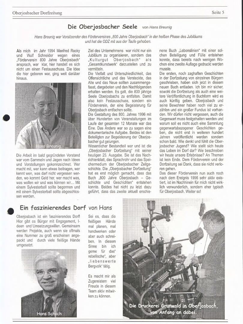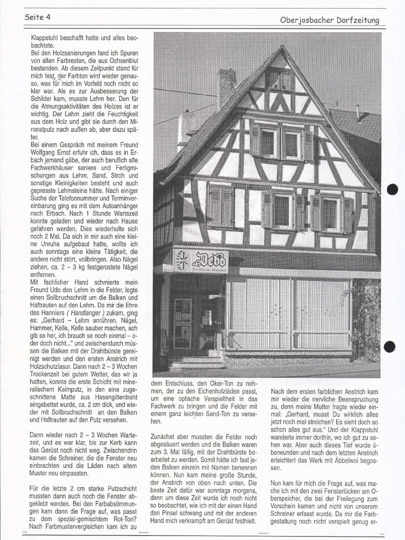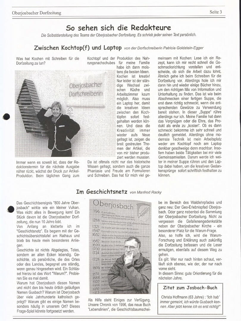 Im November 1994 erschien die erste Ausgabe der Oberjosbacher Dorfzeitung – ursprünglich, um die Oberjosbacher auf das bevorstehende 800-jährige Ortsjubiläum einzustimmen und zu motivieren. Anfangs wurde die Zeitschrift viermal im Jahr veröffentlicht. Doch aufgrund des hohen Arbeitsaufwands und der damals beträchtlichen Druckkosten musste die Erscheinungsfrequenz im Laufe der Jahre reduziert werden – zunächst auf zwei, später auf eine Ausgabe pro Jahr.
