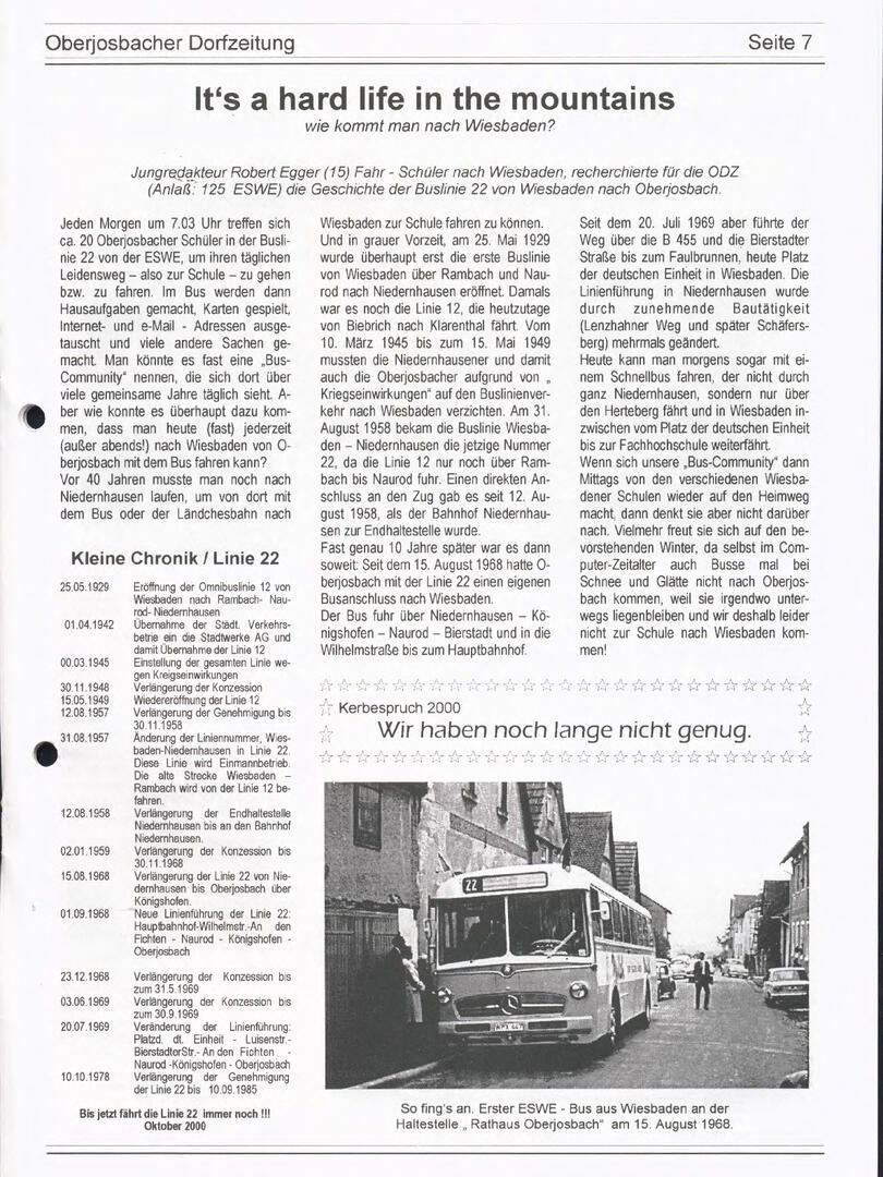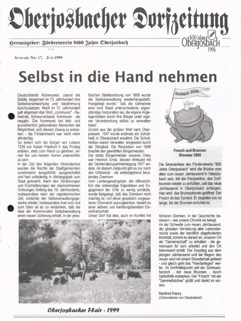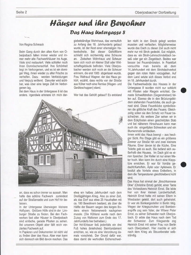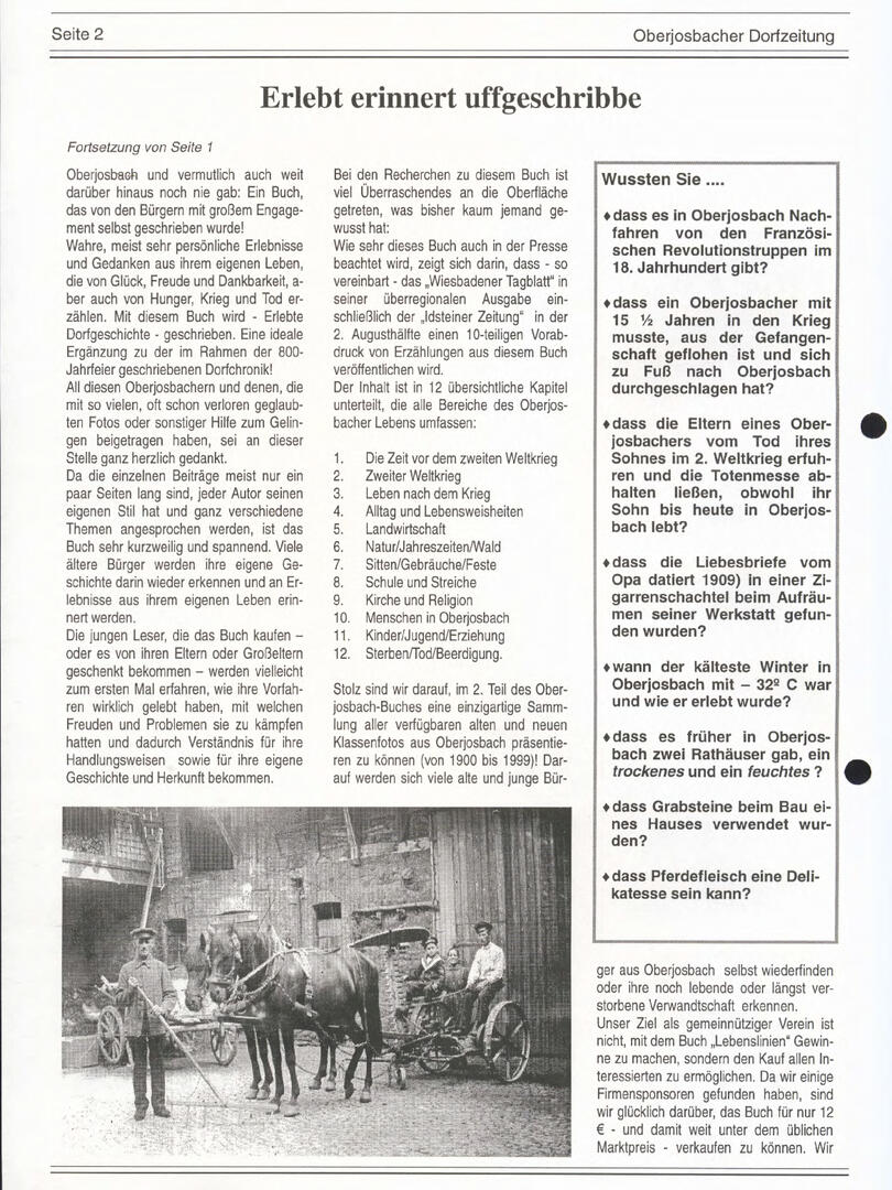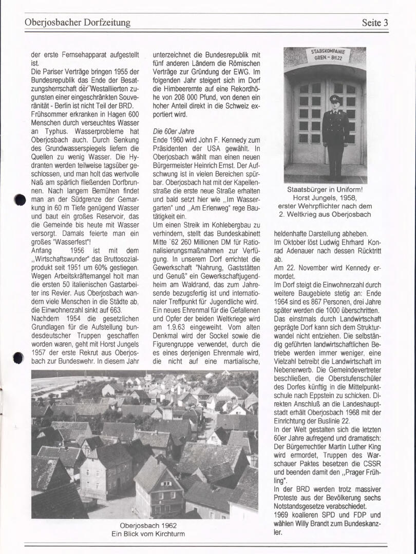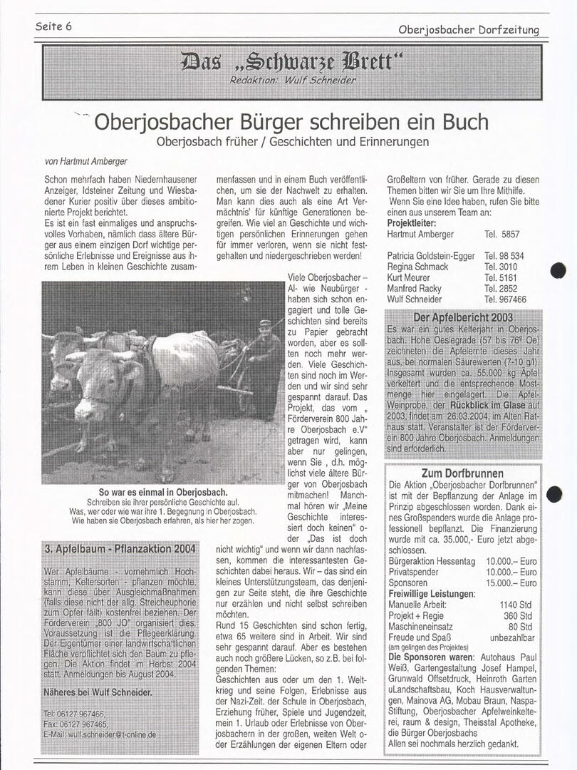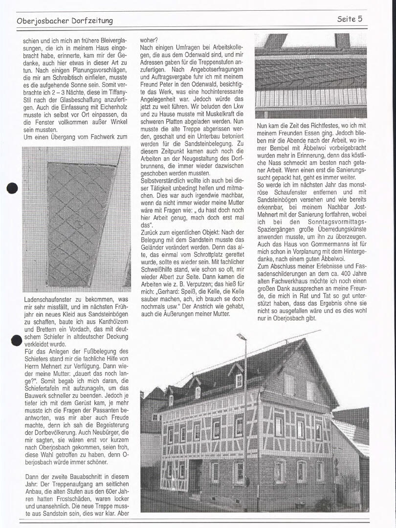 Im November 1994 erschien die erste Ausgabe der Oberjosbacher Dorfzeitung – ursprünglich, um die Oberjosbacher auf das bevorstehende 800-jährige Ortsjubiläum einzustimmen und zu motivieren. Anfangs wurde die Zeitschrift viermal im Jahr veröffentlicht. Doch aufgrund des hohen Arbeitsaufwands und der damals beträchtlichen Druckkosten musste die Erscheinungsfrequenz im Laufe der Jahre reduziert werden – zunächst auf zwei, später auf eine Ausgabe pro Jahr.
