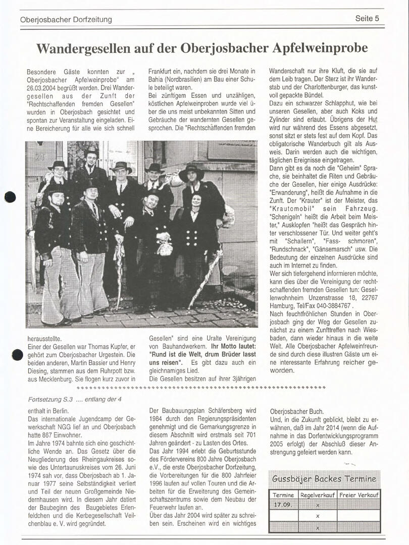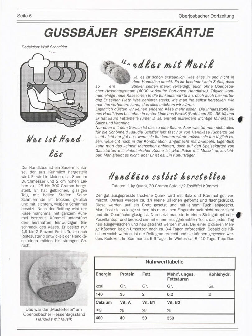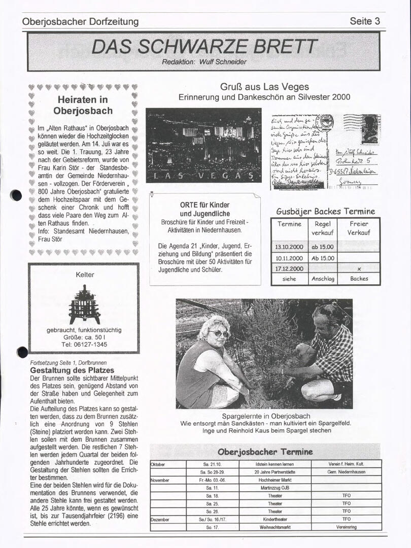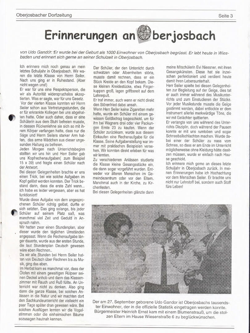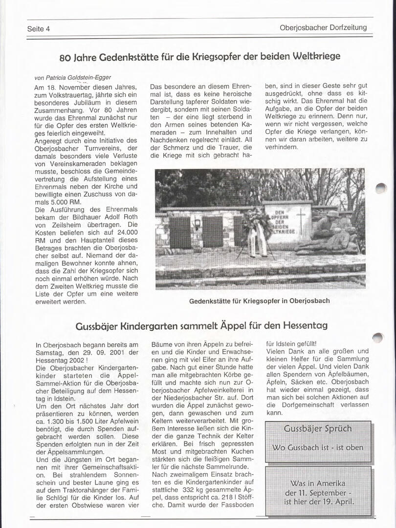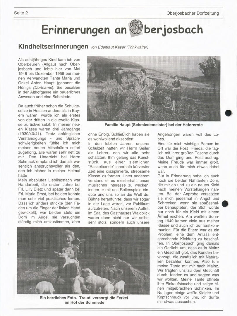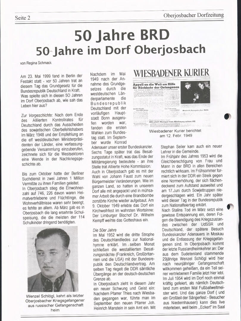 Im November 1994 erschien die erste Ausgabe der Oberjosbacher Dorfzeitung – ursprünglich, um die Oberjosbacher auf das bevorstehende 800-jährige Ortsjubiläum einzustimmen und zu motivieren. Anfangs wurde die Zeitschrift viermal im Jahr veröffentlicht. Doch aufgrund des hohen Arbeitsaufwands und der damals beträchtlichen Druckkosten musste die Erscheinungsfrequenz im Laufe der Jahre reduziert werden – zunächst auf zwei, später auf eine Ausgabe pro Jahr.
